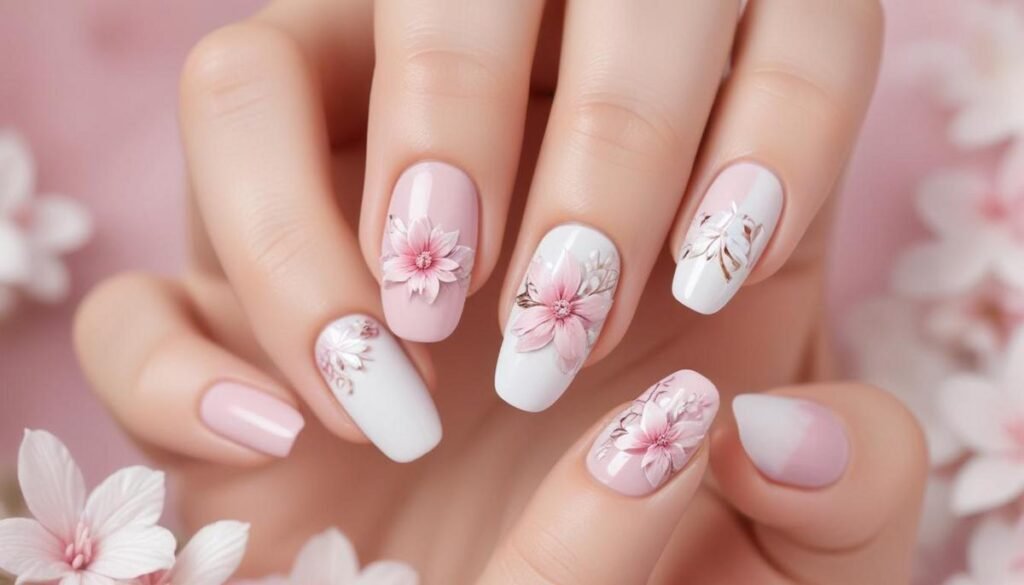 Esmaltes pastéis dominam: Escolha tons suaves como rosa bebê e branco puro para pétalas realistas.
