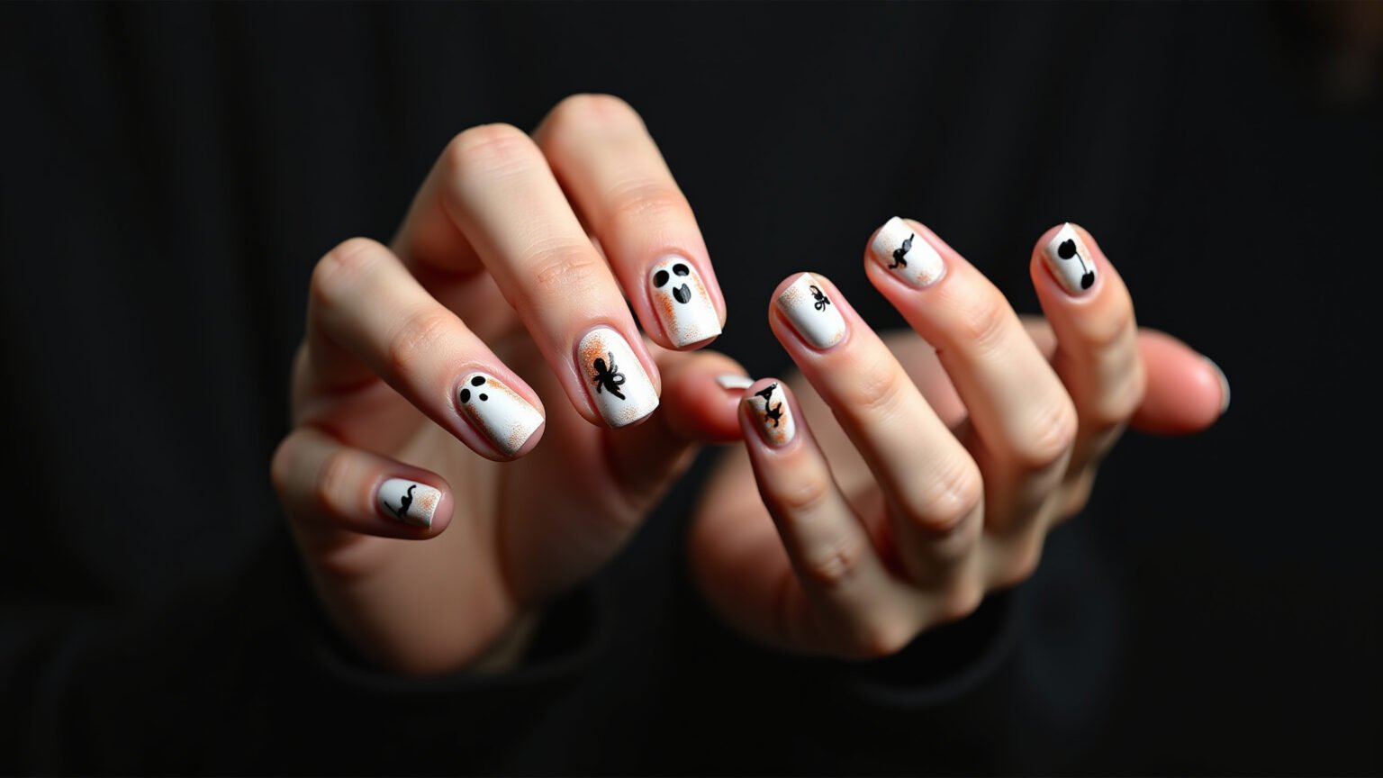 As unhas de fantasma são uma opção clássica e charmosa para o Halloween. Você pode criar fantasminhas fofos em fundo preto ou branco, usando esmaltes e canetas para nail art. Para um toque especial, adicione glitter ou detalhes que brilham no escuro!