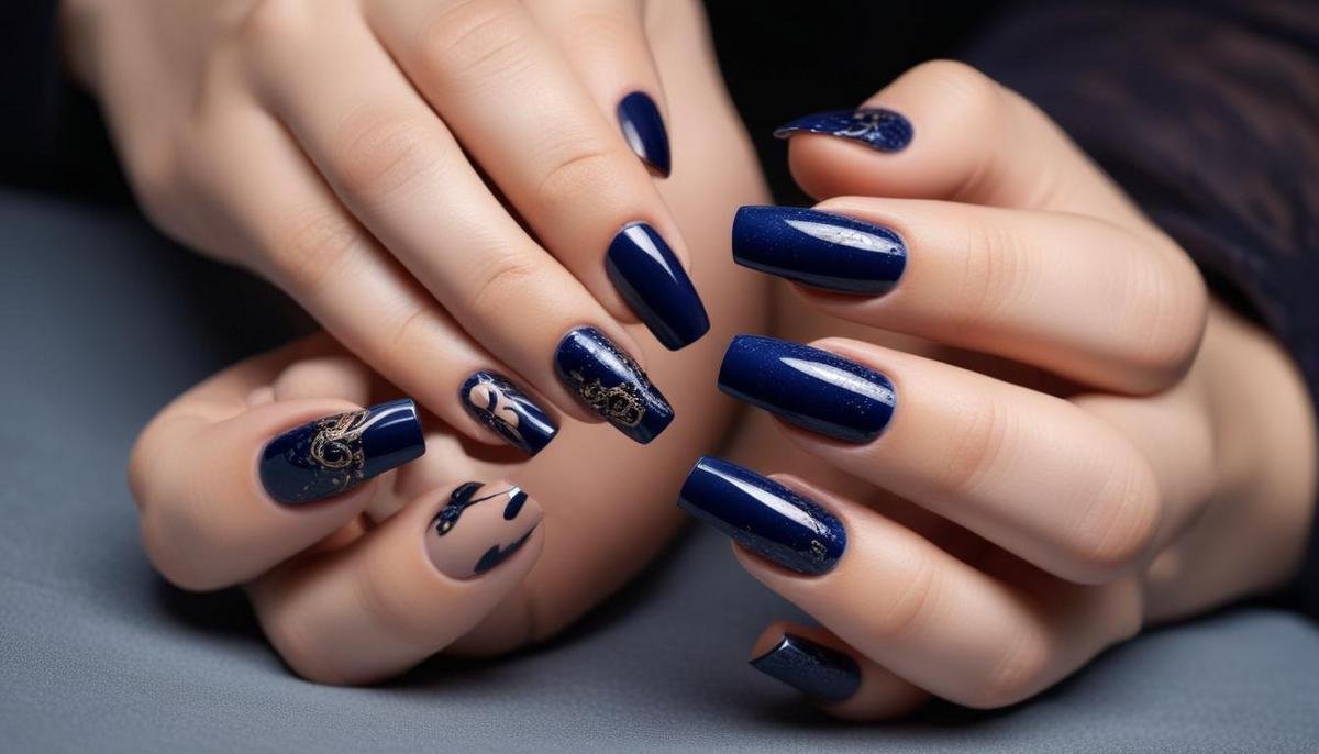 Quais são as técnicas populares para decorar unhas azul escuro?
