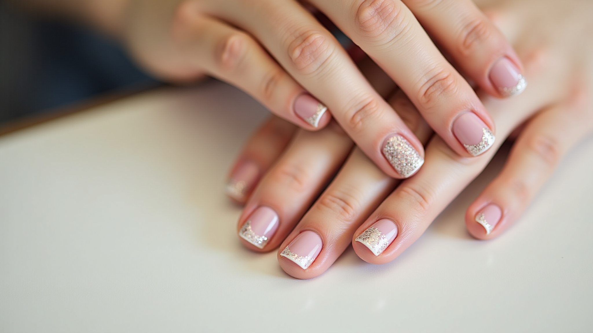 Close-up de mãos femininas exibindo unha decorada simples com glitter.
