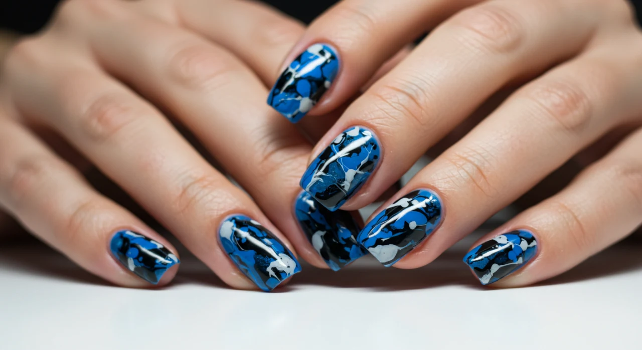 A técnica marmorizada cria um efeito de mármore nas unhas. Você pode fazer uma unha marmorizada com as cores do Grêmio, usando azul, preto e branco. Essa opção é super sofisticada e elegante.