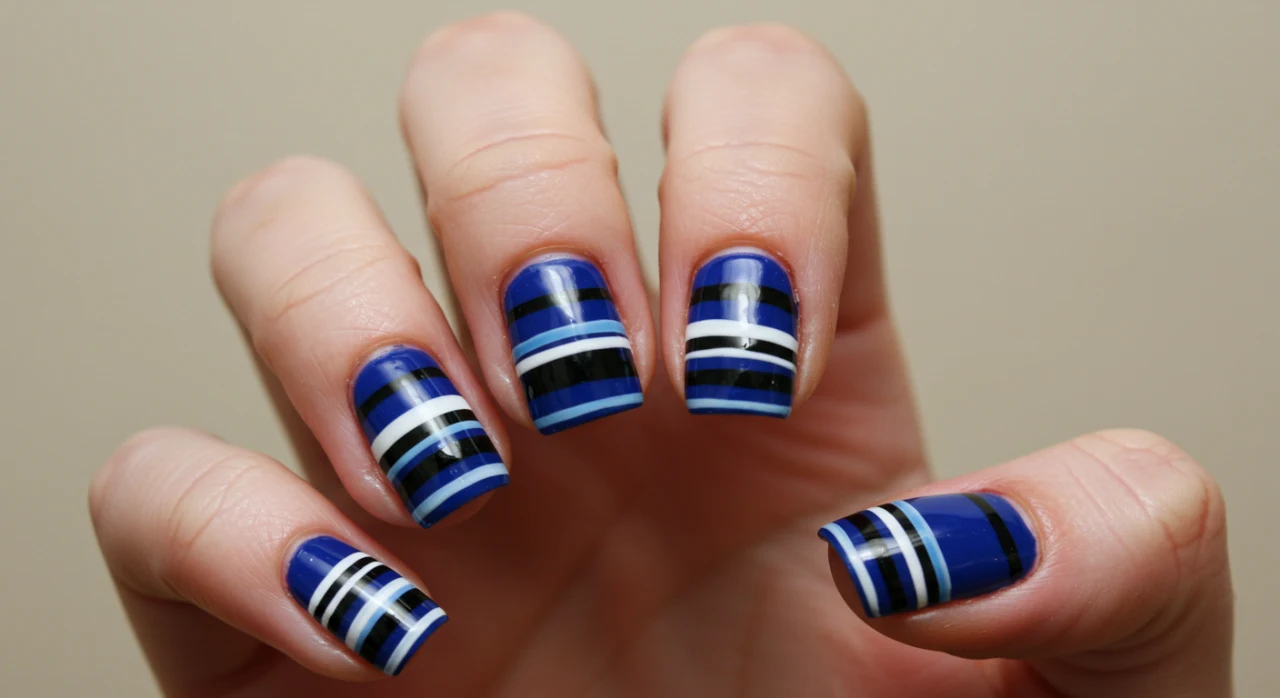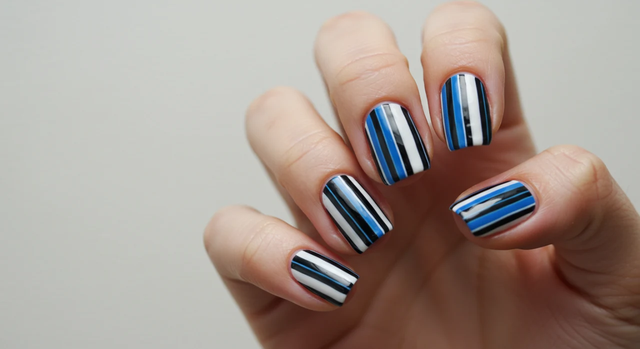 Para um efeito mais moderno, experimente fazer listras finas e grossas, alternando entre elas. Ou, se preferir, pode fazer uma listra grossa no centro da unha e duas listras finas nas laterais.