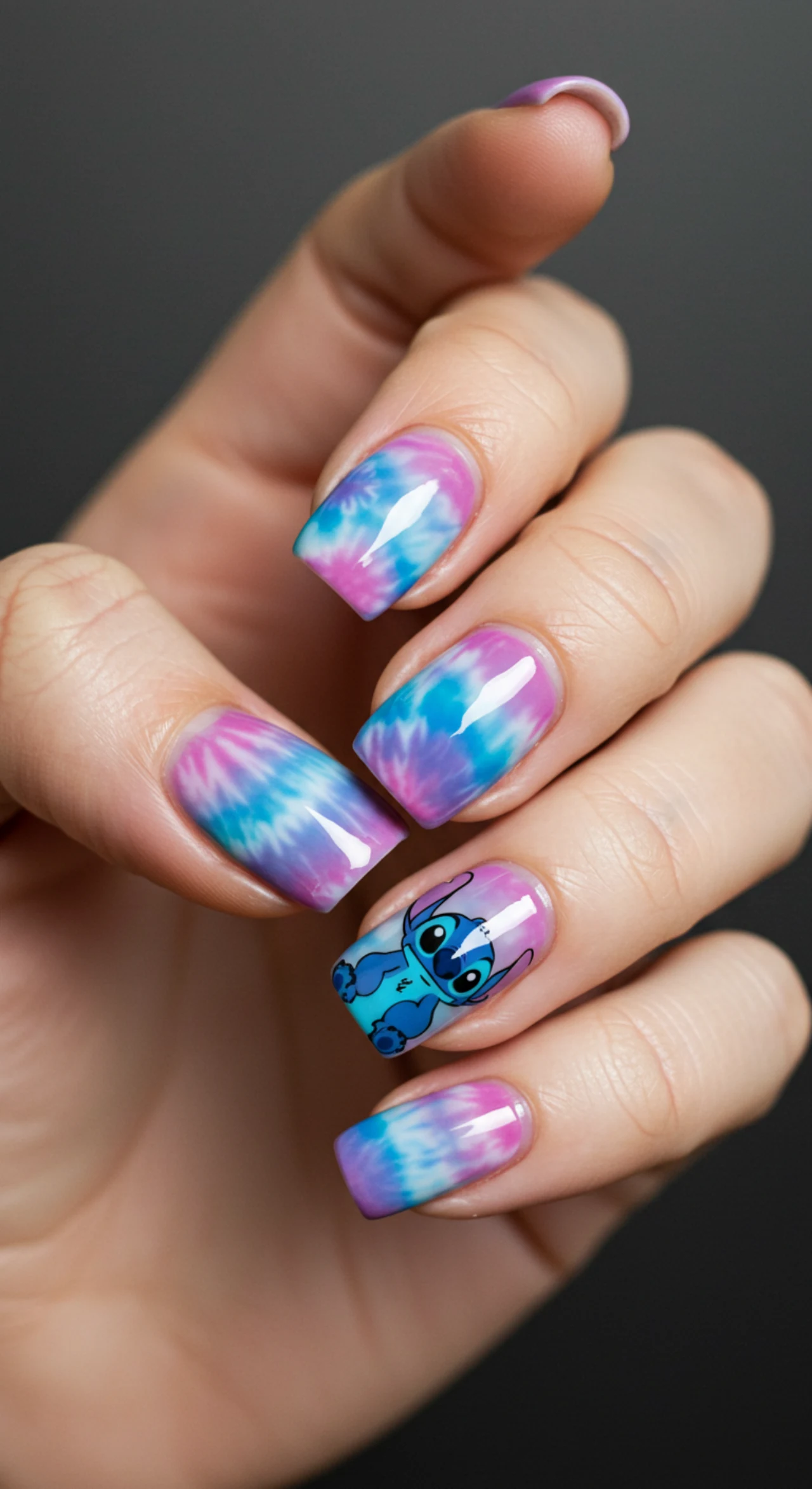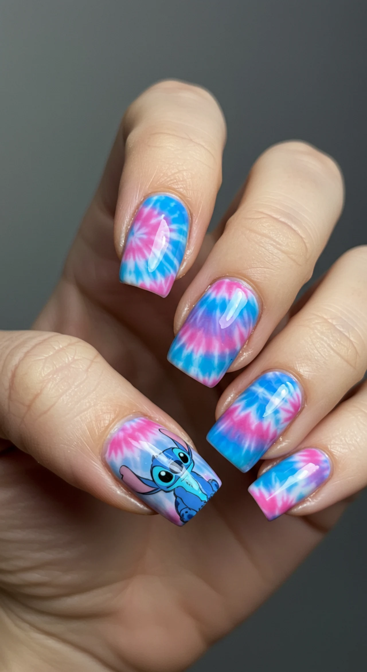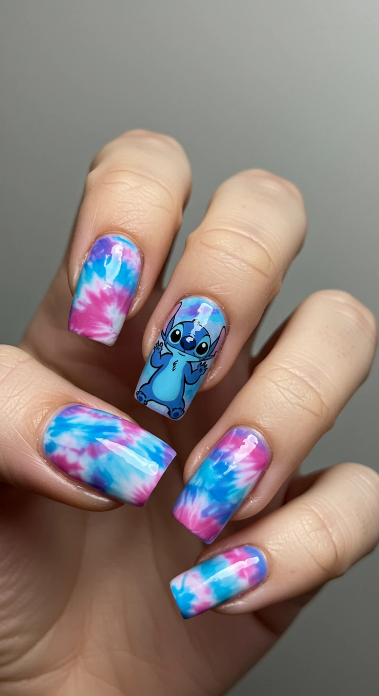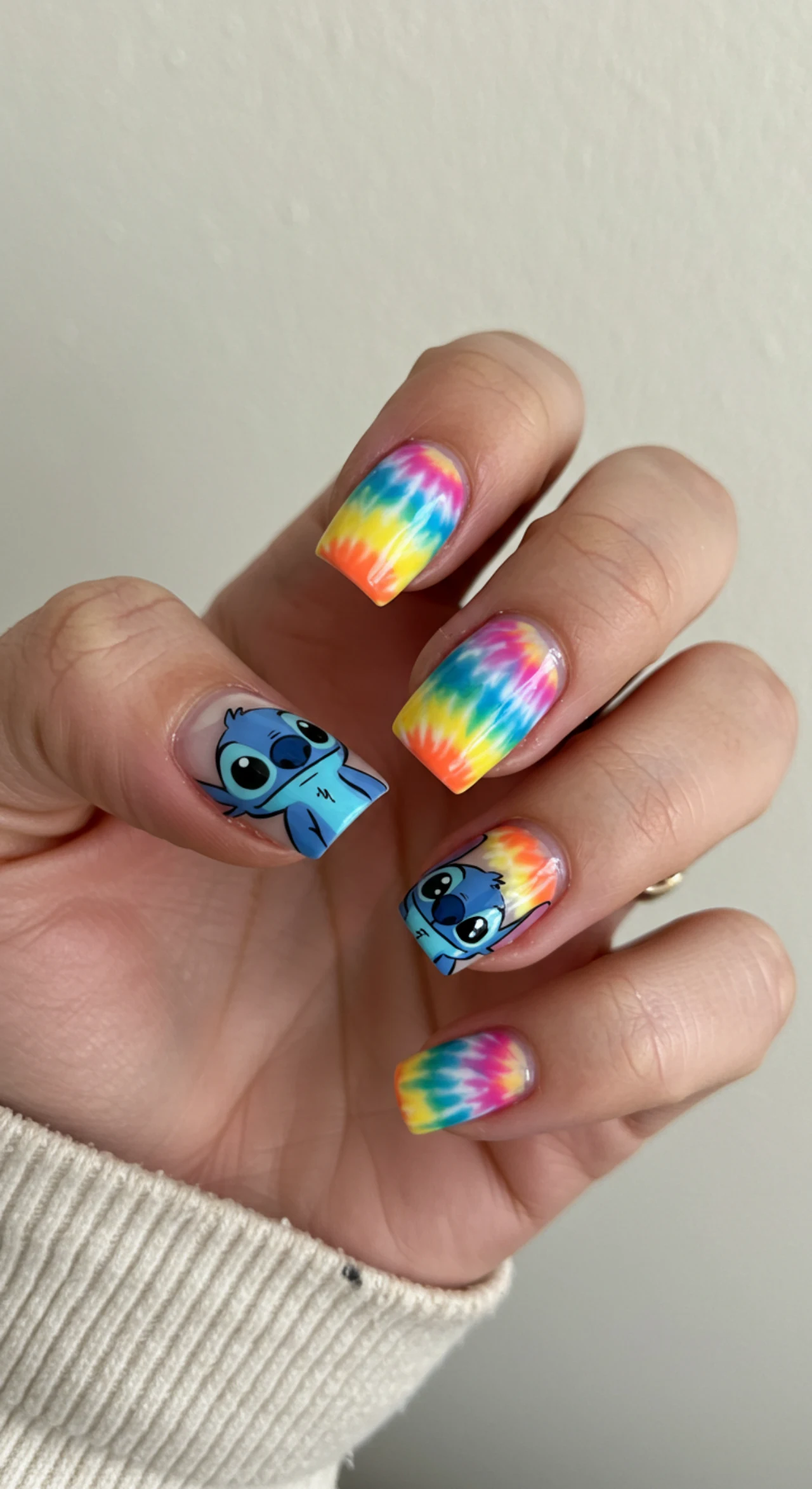 Que tal combinar o Stitch com a tendência tie-dye? Use cores vibrantes e misture-as de forma aleatória para criar um efeito psicodélico nas unhas. O Stitch pode estar no meio desse turbilhão de cores, curtindo a vibe. Uma nail art super original e divertida!