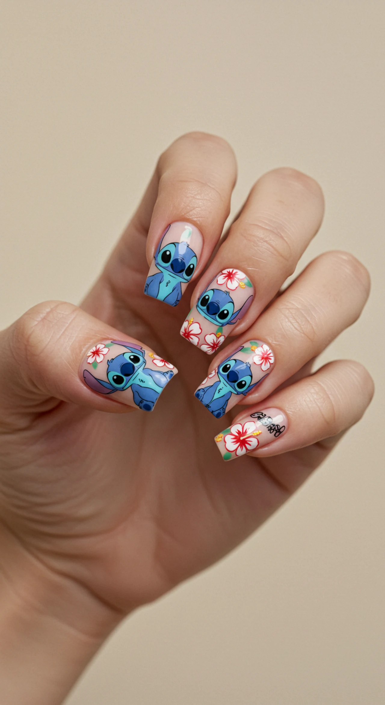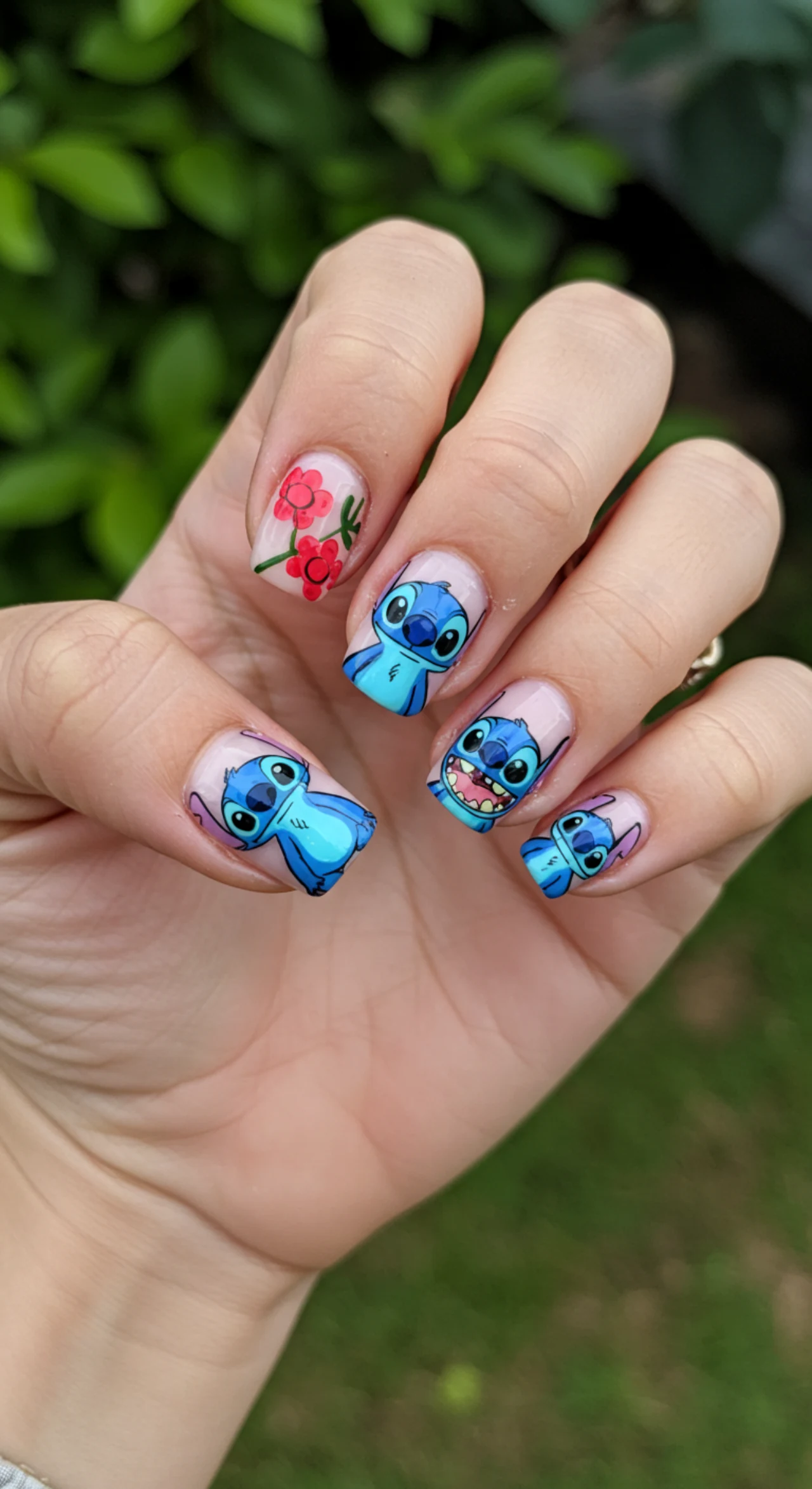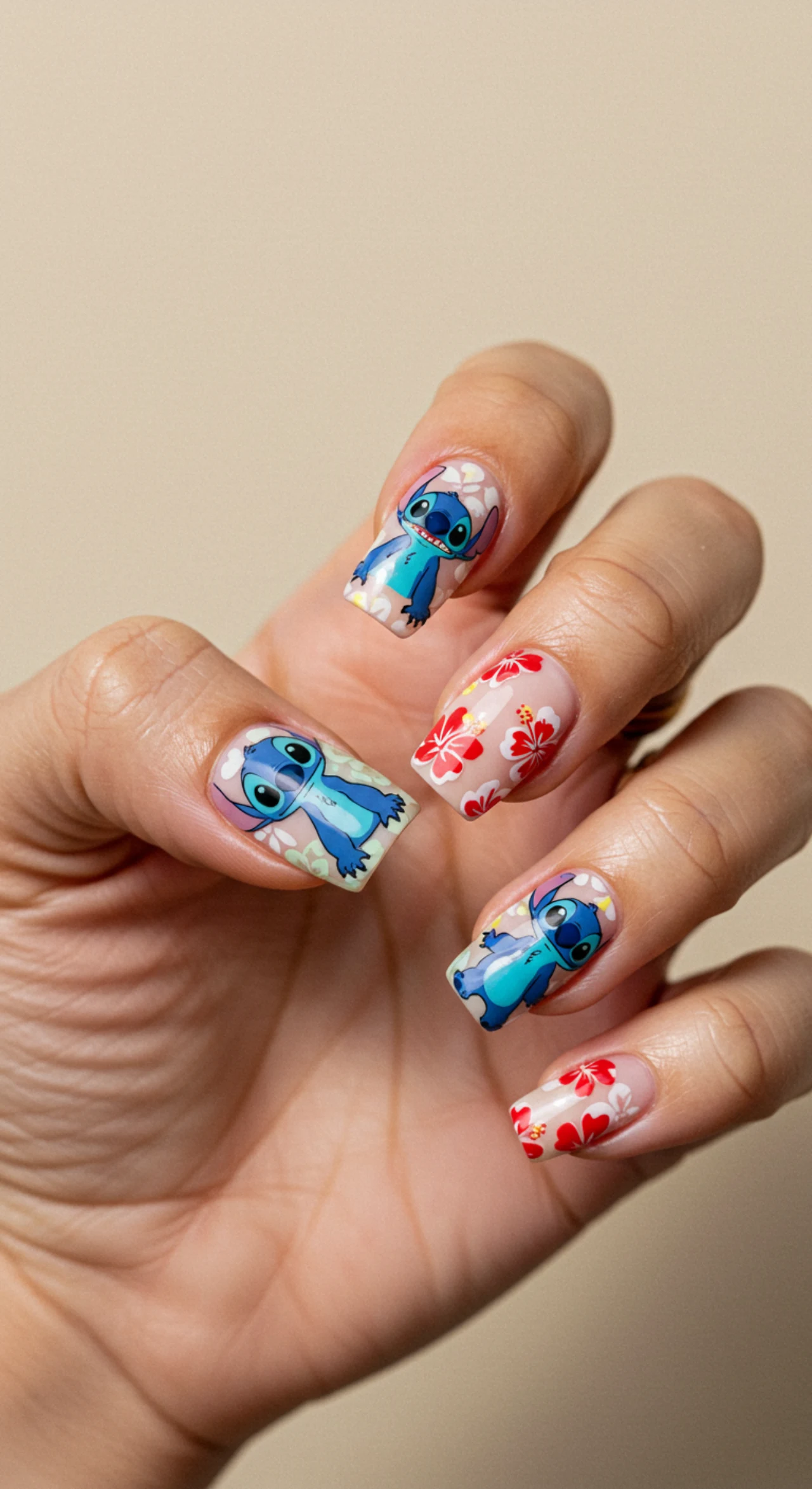 Para as fãs de desenhos animados em geral, que tal combinar o Stitch com outros personagens? Pinte cada unha com um personagem diferente, criando uma mistura divertida e original. O Stitch pode estar ao lado do Mickey, da Minnie, do Pato Donald ou de qualquer outro personagem que você adore. Uma explosão de fofura!