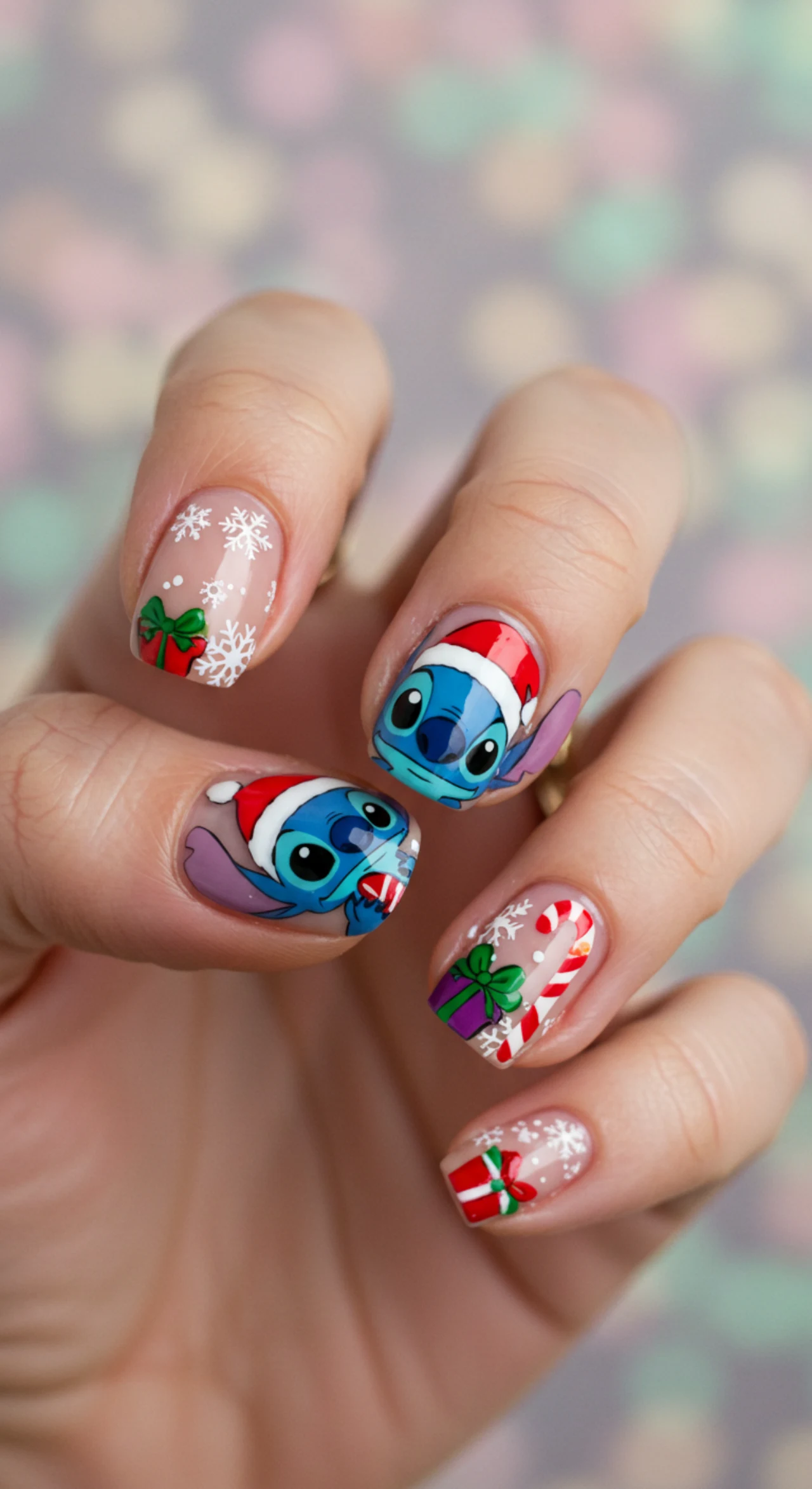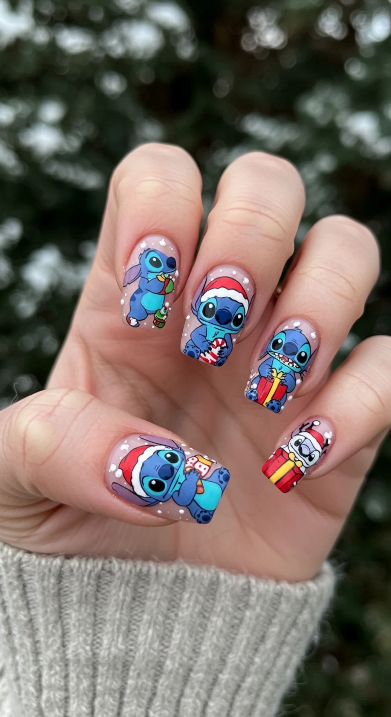 Que tal entrar no clima natalino com uma nail art do Stitch? Pinte as unhas com cores como vermelho, verde e branco, e adicione elementos como árvores de Natal, bonecos de neve e presentes. O Stitch pode estar vestido de Papai Noel, cantando músicas natalinas ou simplesmente curtindo a festa. Um toque festivo e divertido para suas unhas!
