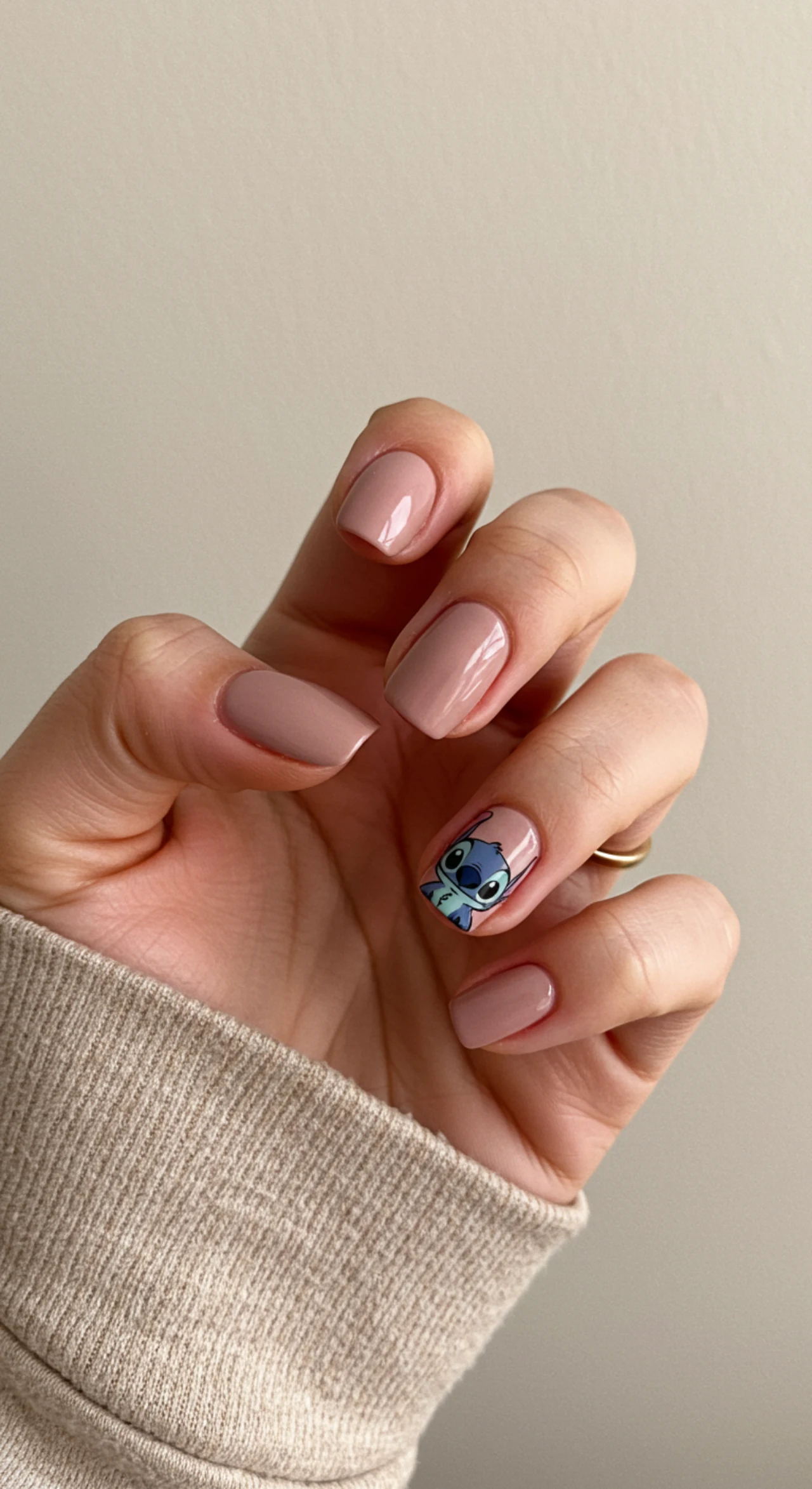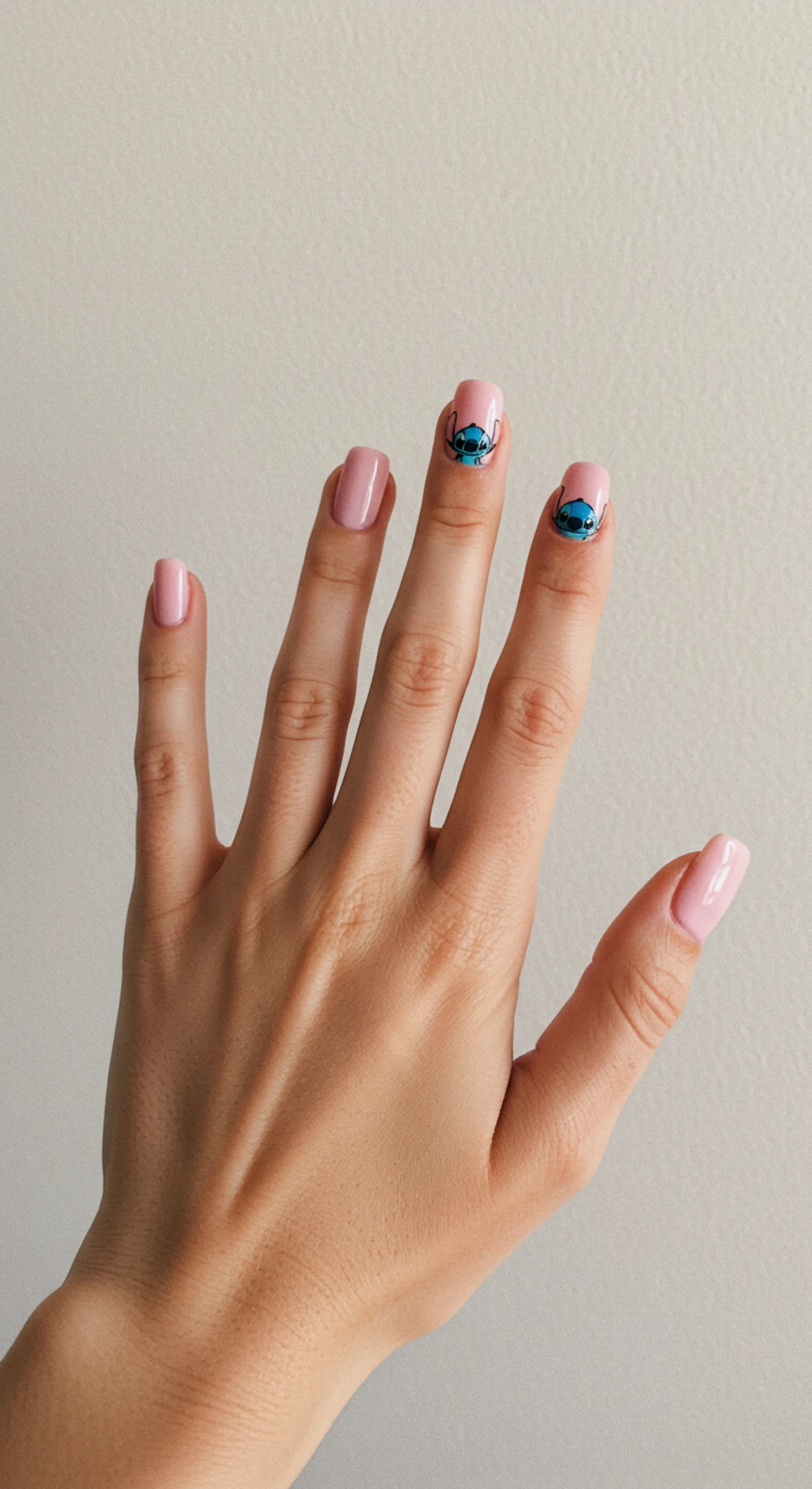 Se você prefere um visual mais discreto, mas sem perder a graça, o Stitch minimalista é a escolha certa. Você pode pintar apenas o rostinho do Stitch em uma ou duas unhas e usar cores neutras nas demais. Uma dica é usar um pincel bem fininho para os detalhes e finalizar com um top coat para maior durabilidade. Imagina que charme!